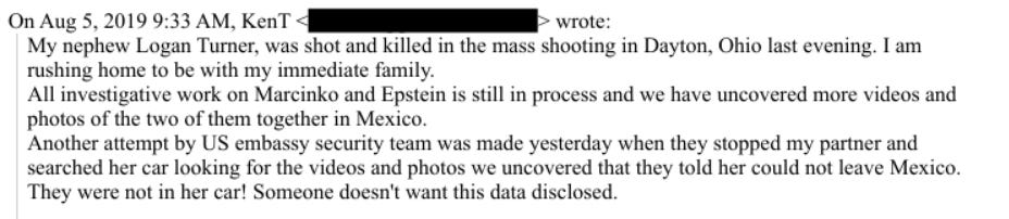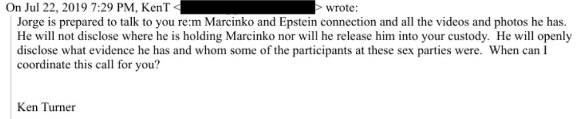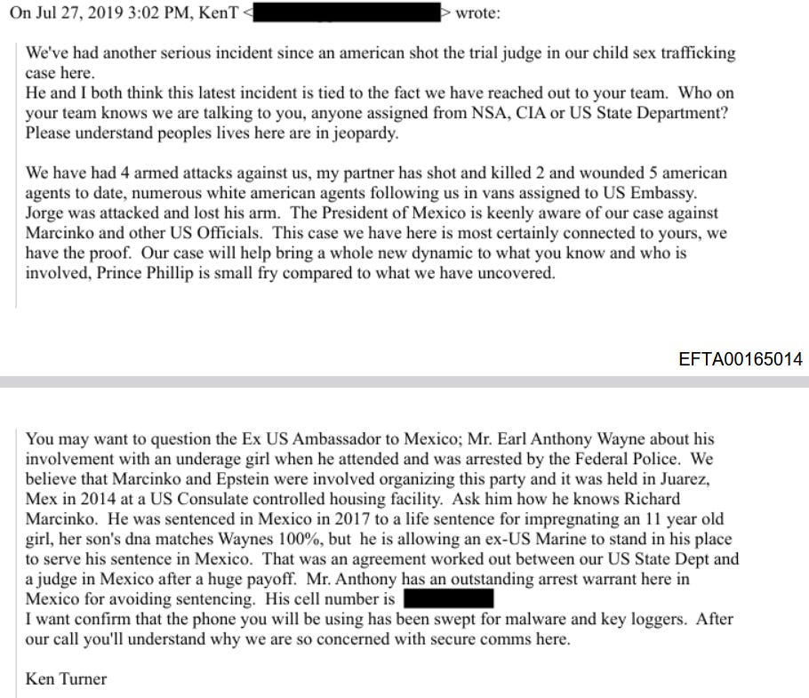 One can only speculate who this “high powered individual” is, but considering the timing of this email and Trump’s extensive involvement with Epstein, it is plausible that Turner was referring to Trump himself. Especially if these threats against Turner and his team were being issued directly to AMLO, it’s hard to think of many other people that would have a direct line to the Mexican President. At this point Turner and his Mexican counterpart Jorge Gonzalez had Richard Marcinko in custody in a secret location- and Epstein was still alive.