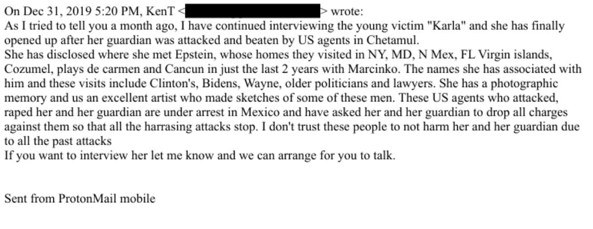 Reading this email, we see a very familiar name being dropped. Being an uncommon name, it is safe to assume that the ‘Biden’ in question belongs to the Biden political family. It would be pure speculation to suggest which Biden it is, but we are reminded of Joe Biden’s numerous accusations of assault and sexual misconduct and Hunter Biden’s child pornography allegations. In addition, it is worth noting that Ambassador Wayne was an Obama appointee, and friend of Joe Biden. In 2012, Joe Biden visited Ambassador Wayne, and toured a historic catholic church in Mexico City.9